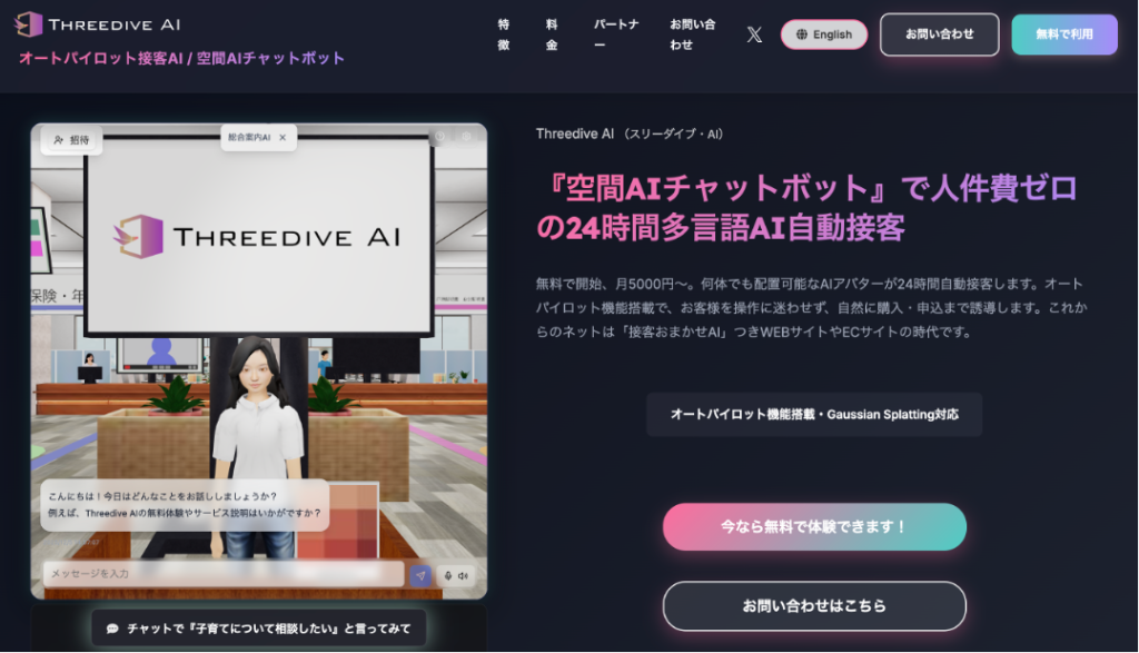 「Threedive AI(スリーダイブ・エーアイ)」は、Web上にAIアバターを複数配置し、訪問者に自然な案内・接客体験を提供できるオートパイロット接客AI/空間型AIチャットボットです。わずか数行のコードを追加するだけで導入でき、従来のテキストベースのチャットボットを超えた直感的かつ没入感のある3D-AIインタラクションをWebサイトに実装可能です。